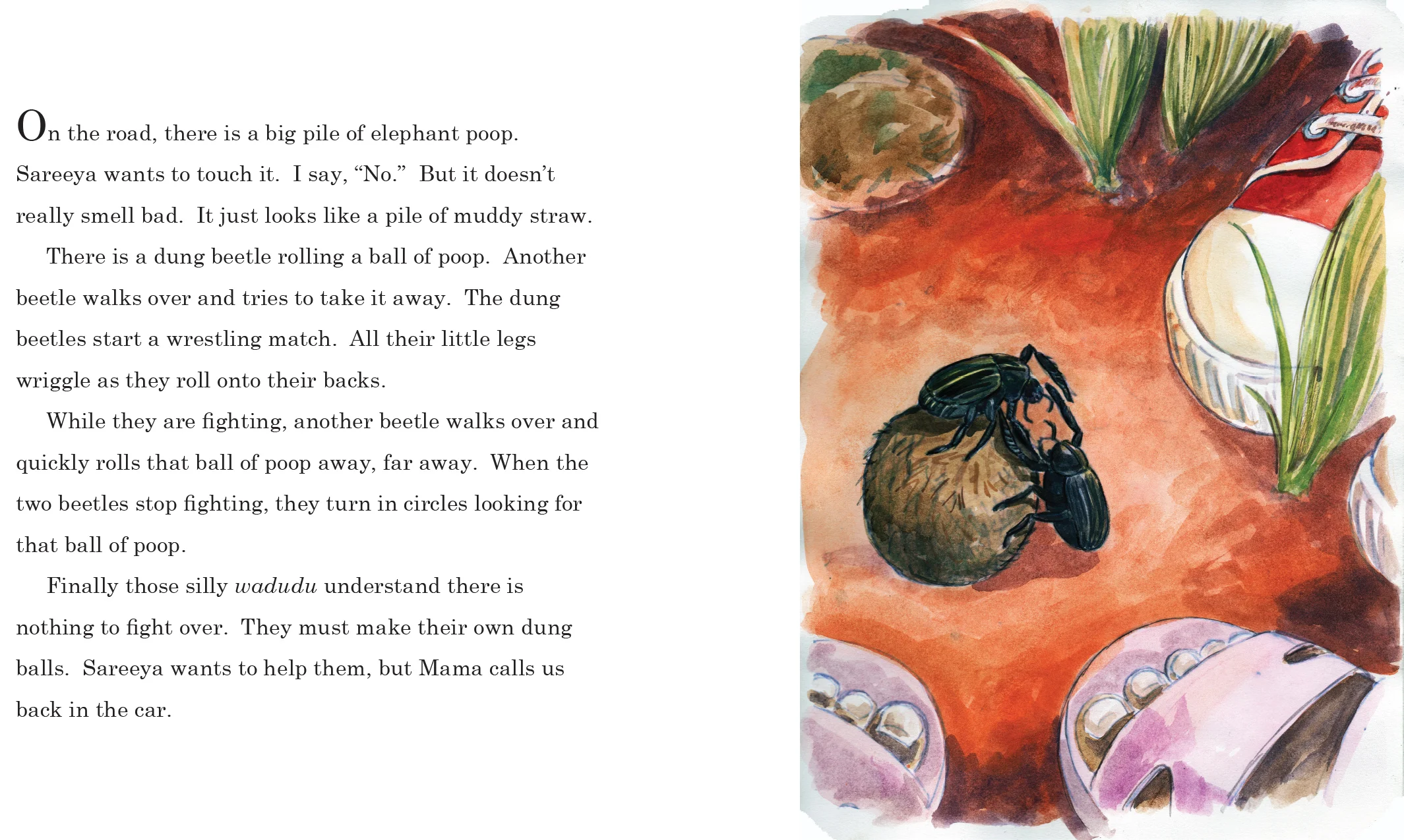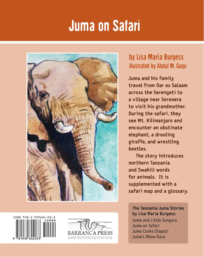 plains of the Serengeti. During the journey, they see Mt. Kilimanjaro and encounter an obstinate elephant, a drooling giraffe, and wrestling beetles. The story introduces northern Tanzania and ki-Swahili words for animals. The story is supplemented with a national map of the United Republic of Tanzania, a map of the continent of Africa, and a Swahili language glossary.