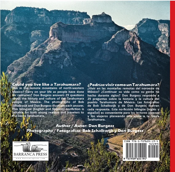 Could you live like a Tarahumara? Live in the remote mountains of north-western Mexico? Carry on your life as people have done for centuries? Don Burgess answers 30 questions about the history and culture of the Tarahumara people of Mexico. The black and white photographs of Bob Schalkwijk and Don Burgess illustrate each answer. This bilingual (English and Spanish) nonfiction is suitable for both young readers and travelers to the Sierra Tarahumara.